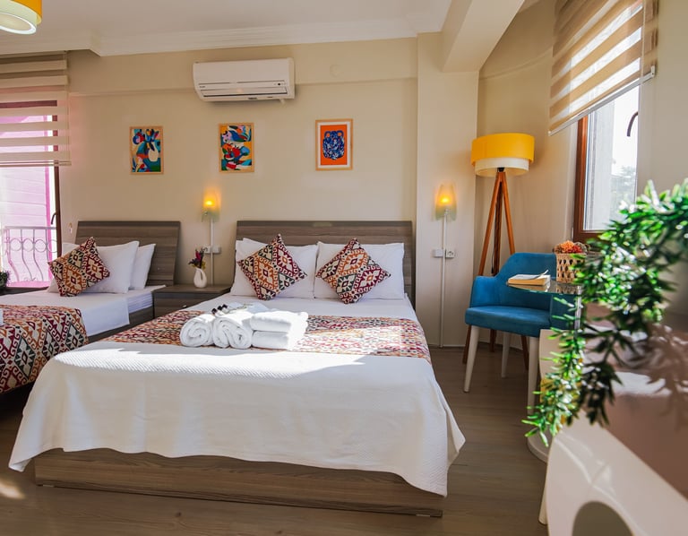 Odalarımızı tasarlarken sadelik ve konforu bir arada sunmaya özen gösterdik. Gün boyu denizin ve güneşin tadını çıkardıktan sonra serin, huzurlu ve rahat bir ortamda dinlenebilmeniz için tüm detayları düşündük. Temizlik ve düzen ise bizim en hassas olduğumuz konu.